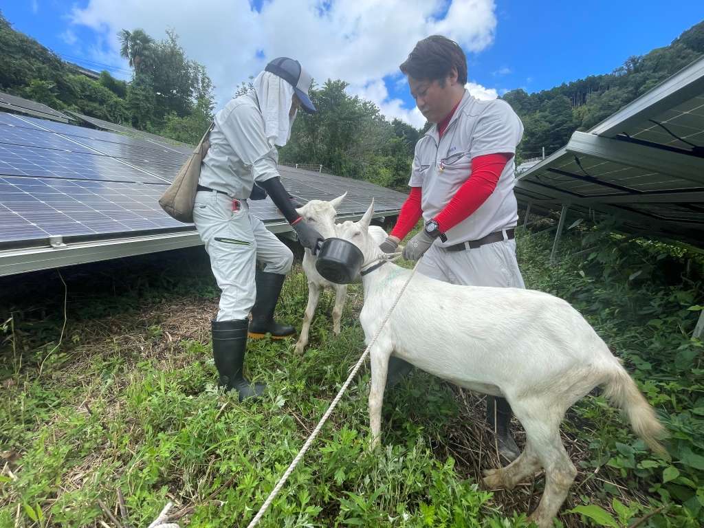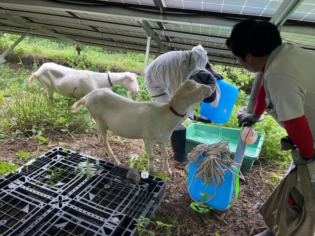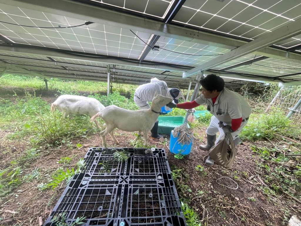 太陽光発電パネルには、背丈の高い草やつる草は大敵なのですが、その草をヤギさんたちはとても好んで食します。