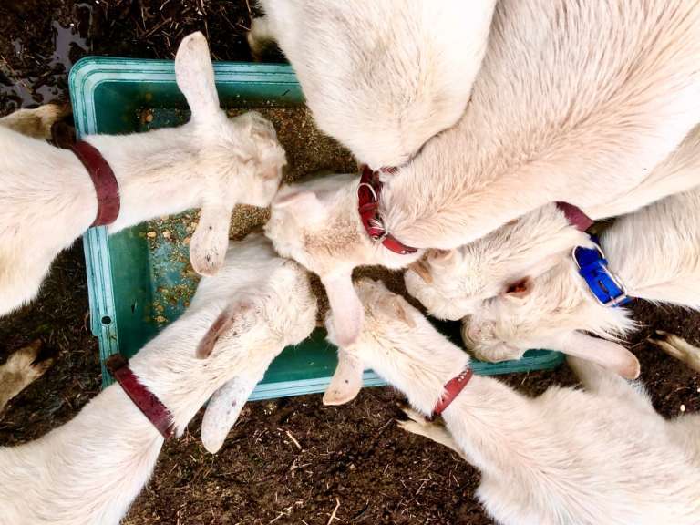 妊娠中のヤギさんもその他のヤギさんもみんないっせいに配合飼料に群がります。