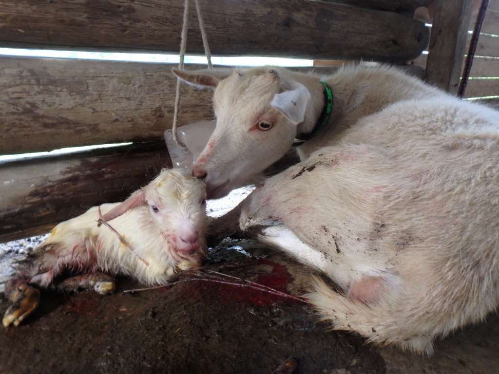 産子数は1頭か2頭、まれにに3頭生まれます。陣痛から出産までは比較的スムーズで短時間ですが、初産で神経質な母ヤギさんは助産が必要な場合もあります。