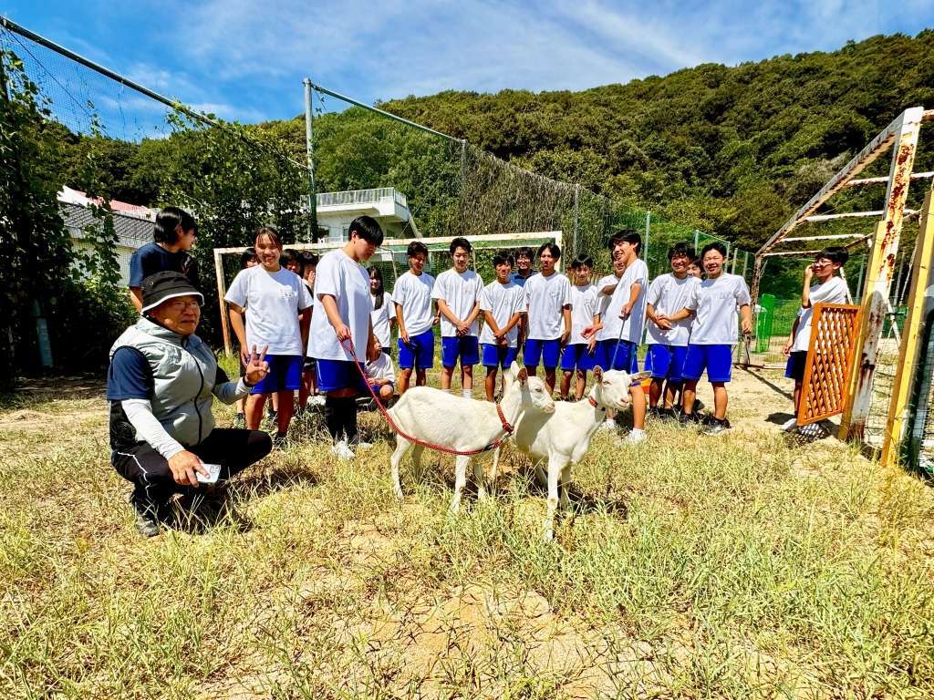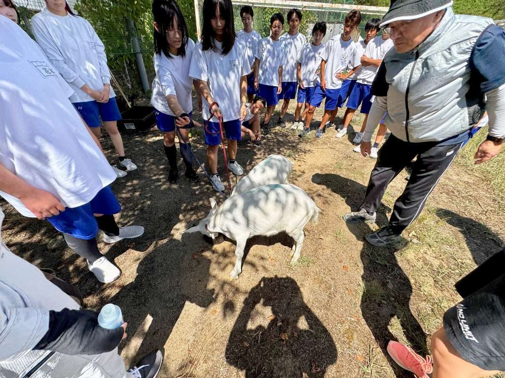 本社放牧場で今年2月に生まれた兄弟の子ヤギさんを、校長先生はじめ先生方、生徒の皆さんに歓迎して頂きました。