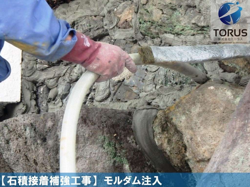 セメント:砂:専用接着剤(モルダムGハイパー)を配合した充填剤をモルタルポンプにて注入します。