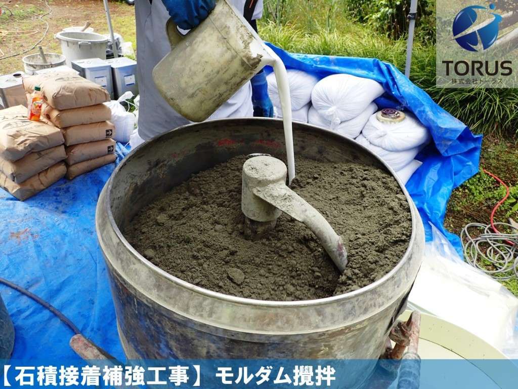 セメント:砂:専用接着剤(モルダムGハイパー)を配合した充填剤をモルタルポンプにて注入します。