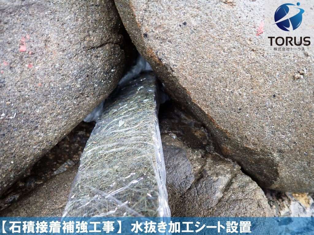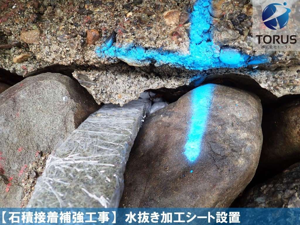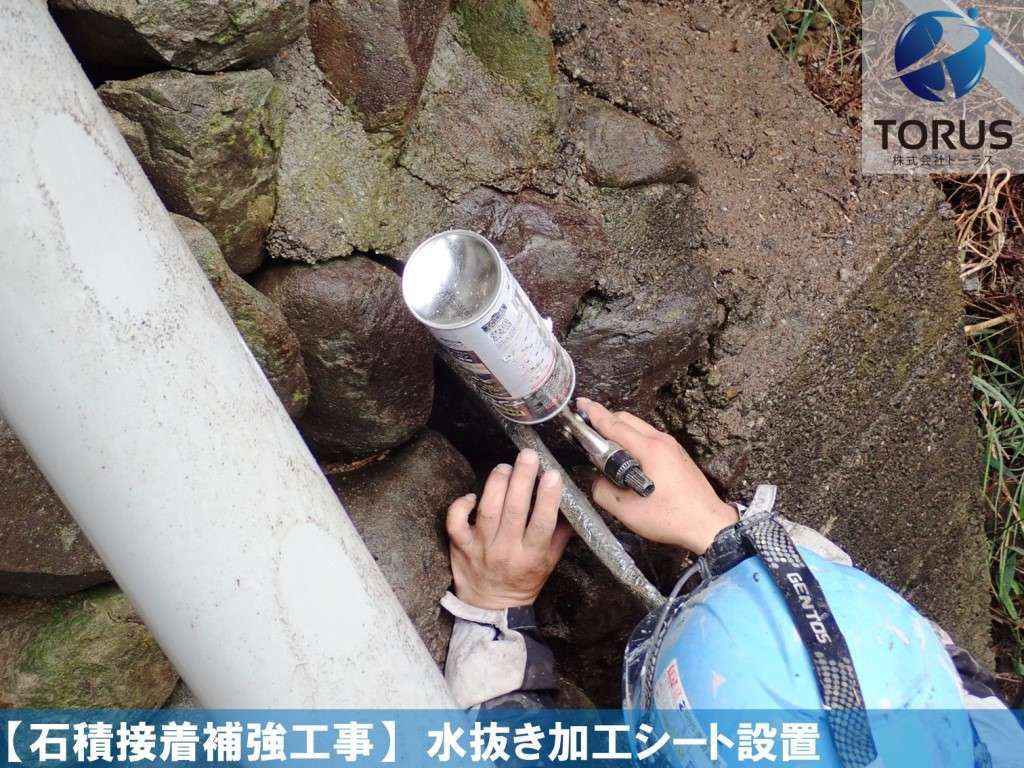 水抜き加工シートの先端を閉塞しないように発泡固化剤にて遮蔽層を形成します。