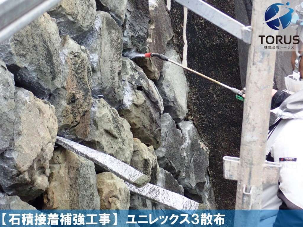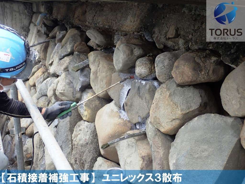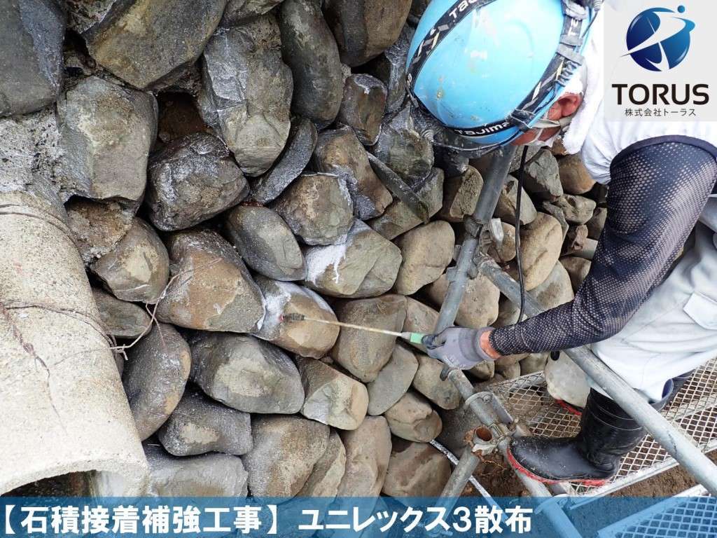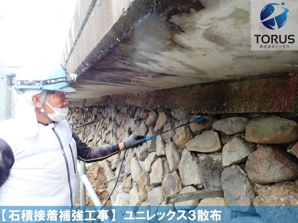 塗布型吸水調整剤を石積み空洞部に吹き付けします。