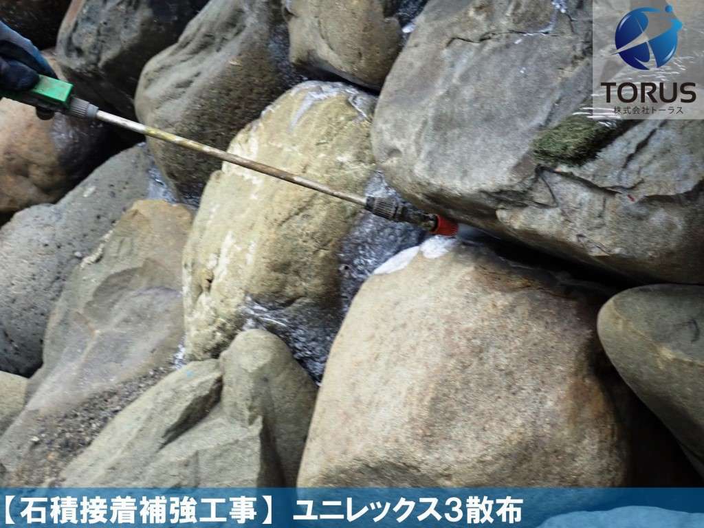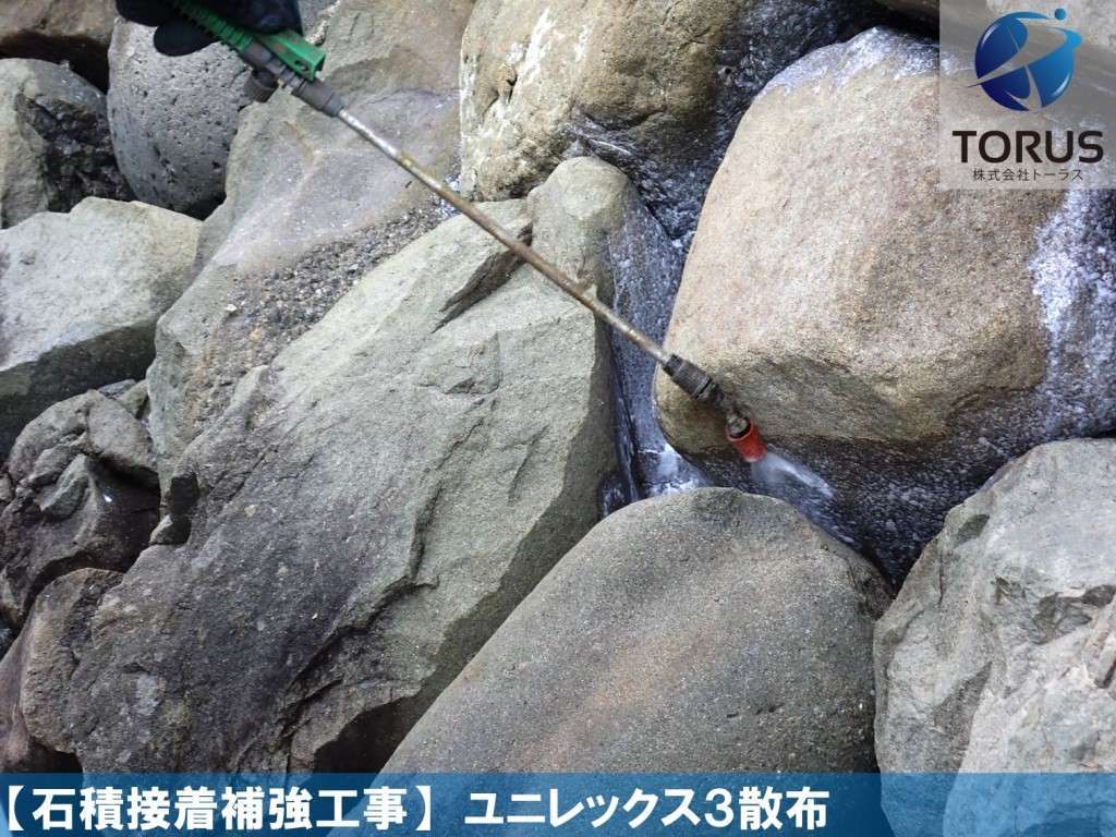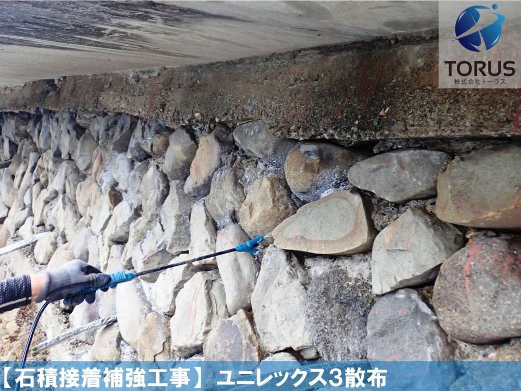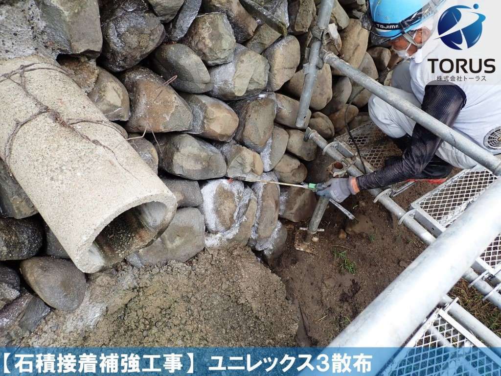 塗布型吸水調整剤を石積み空洞部に吹き付けします。