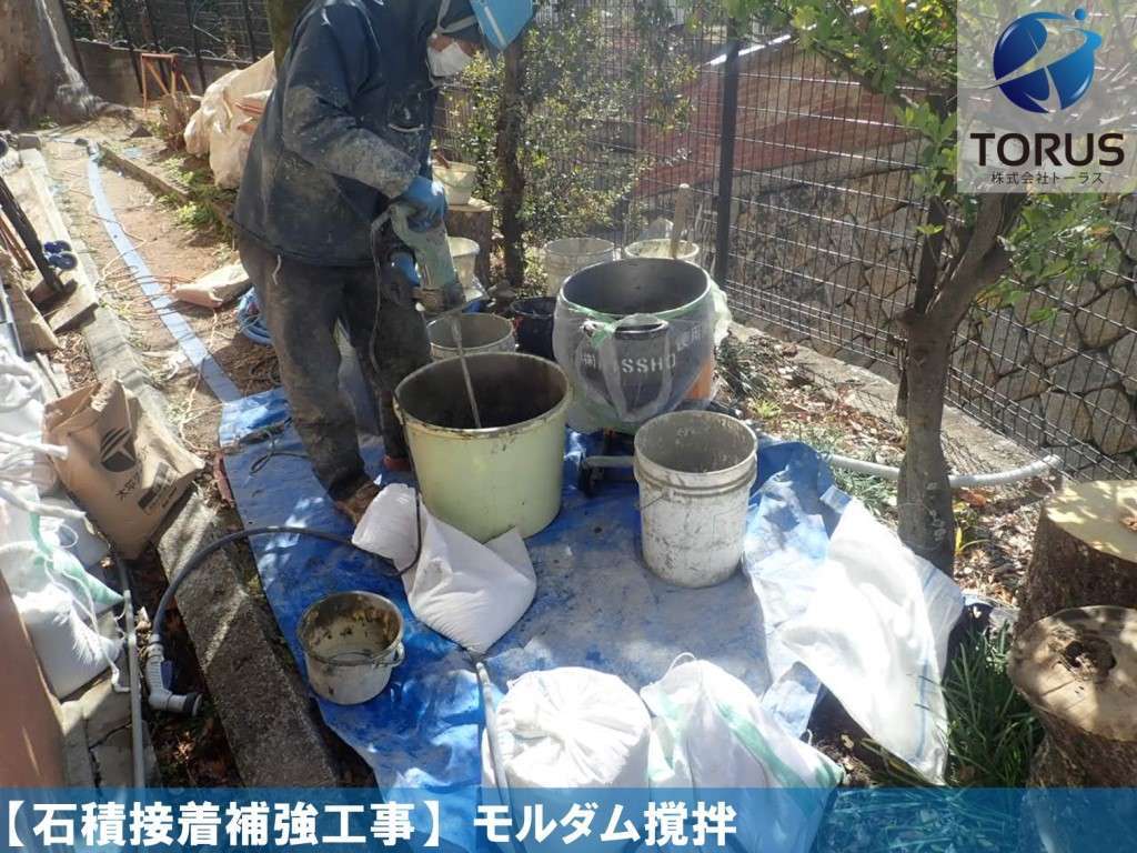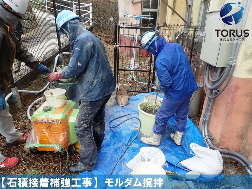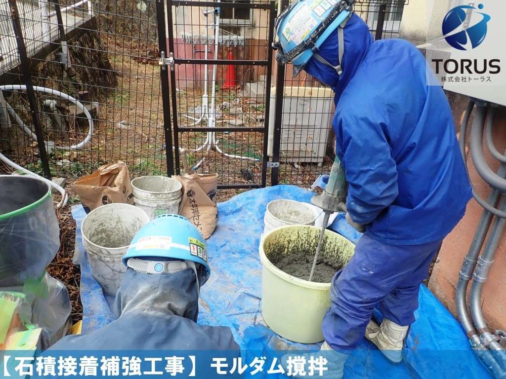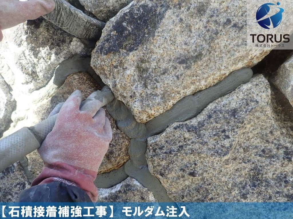 セメント:砂:専用接着剤(モルダムGハイパー)を配合した充填剤をモルタルポンプにて注入します。