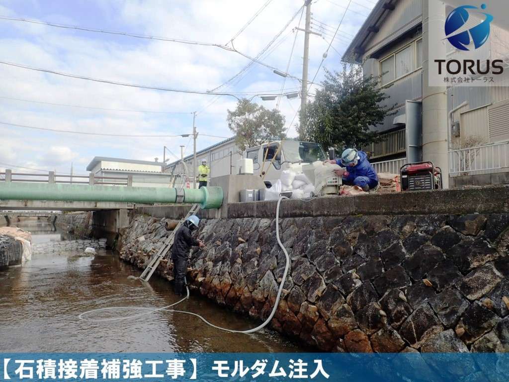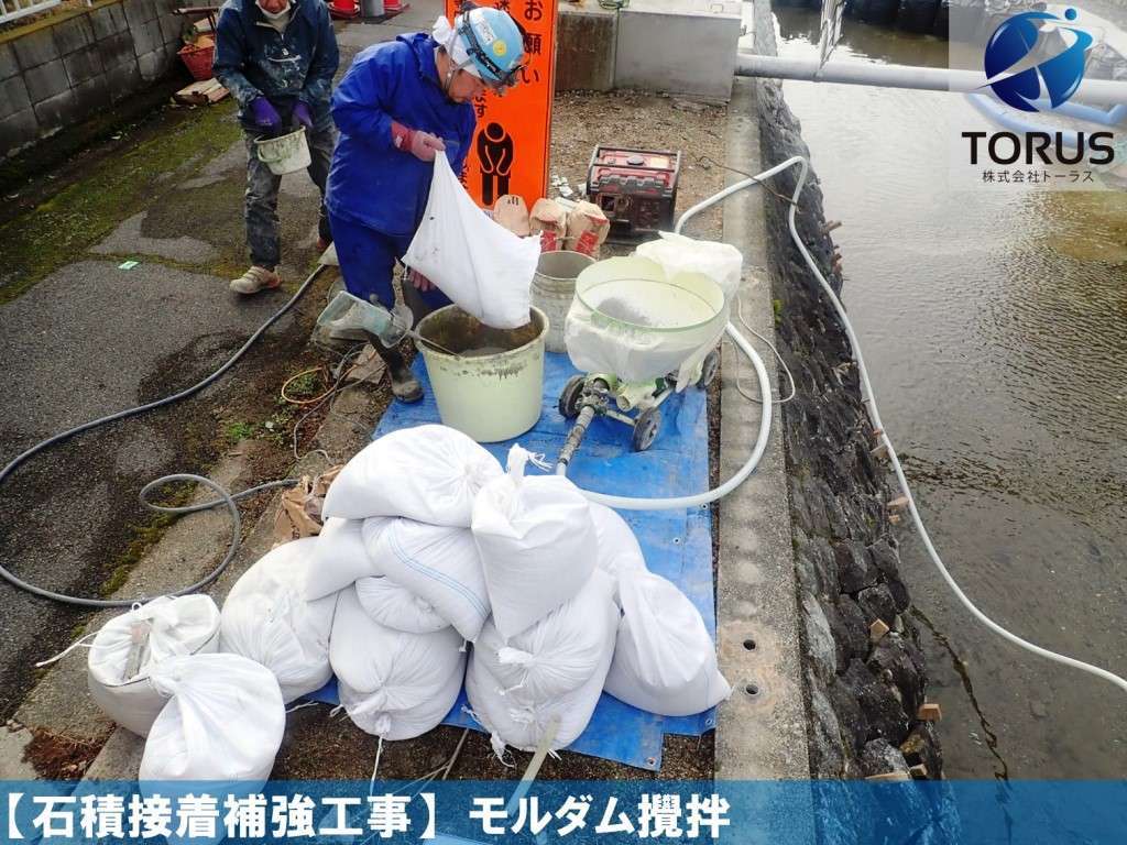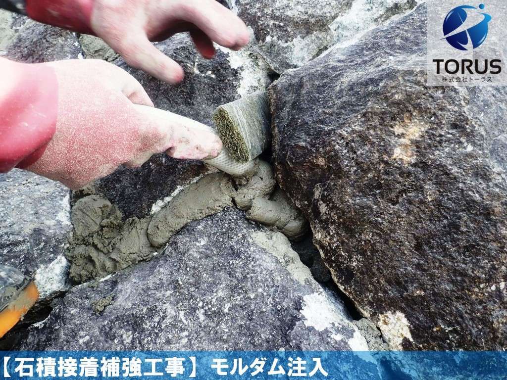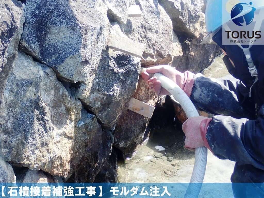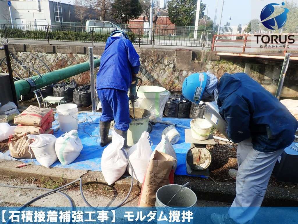 セメント:砂:専用接着剤(モルダムGハイパー)を配合した充填剤をモルタルポンプにて注入します。
