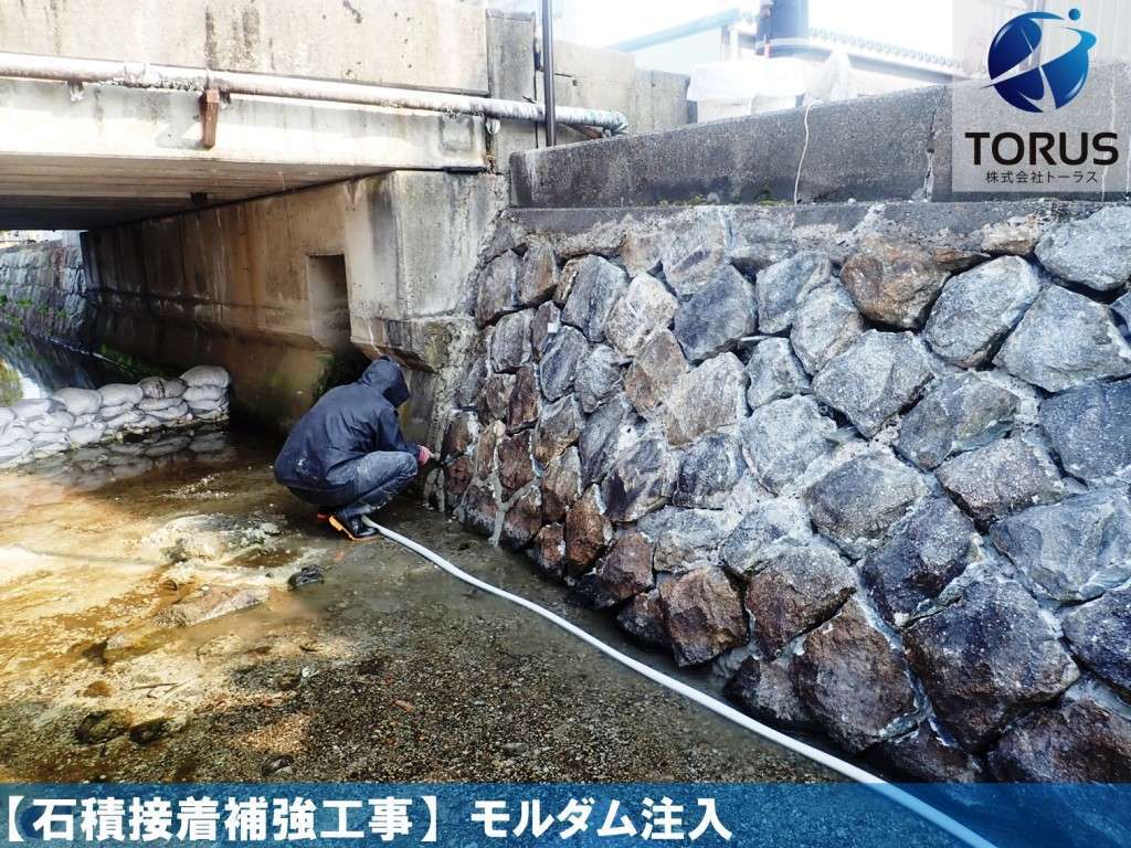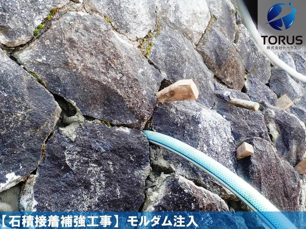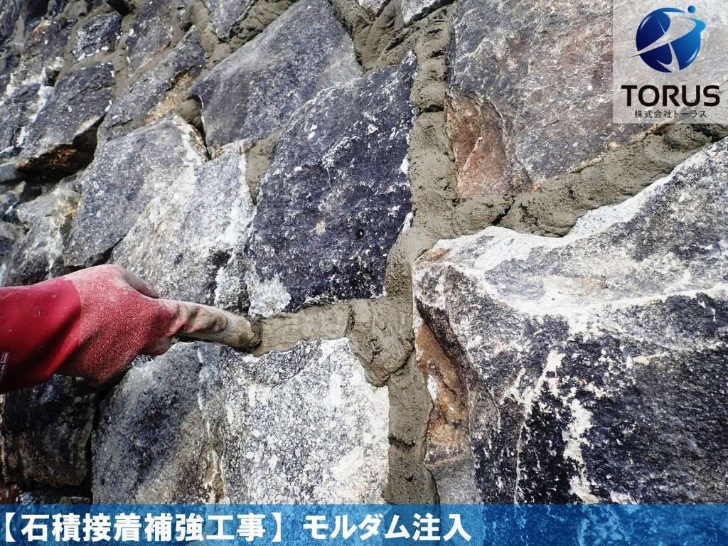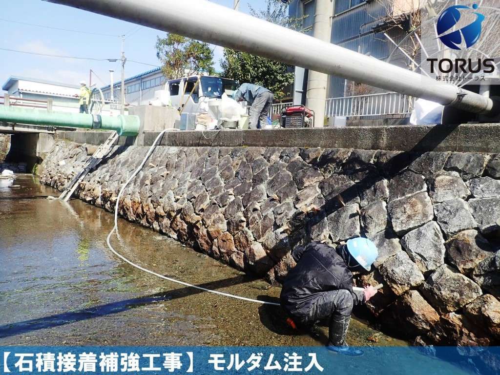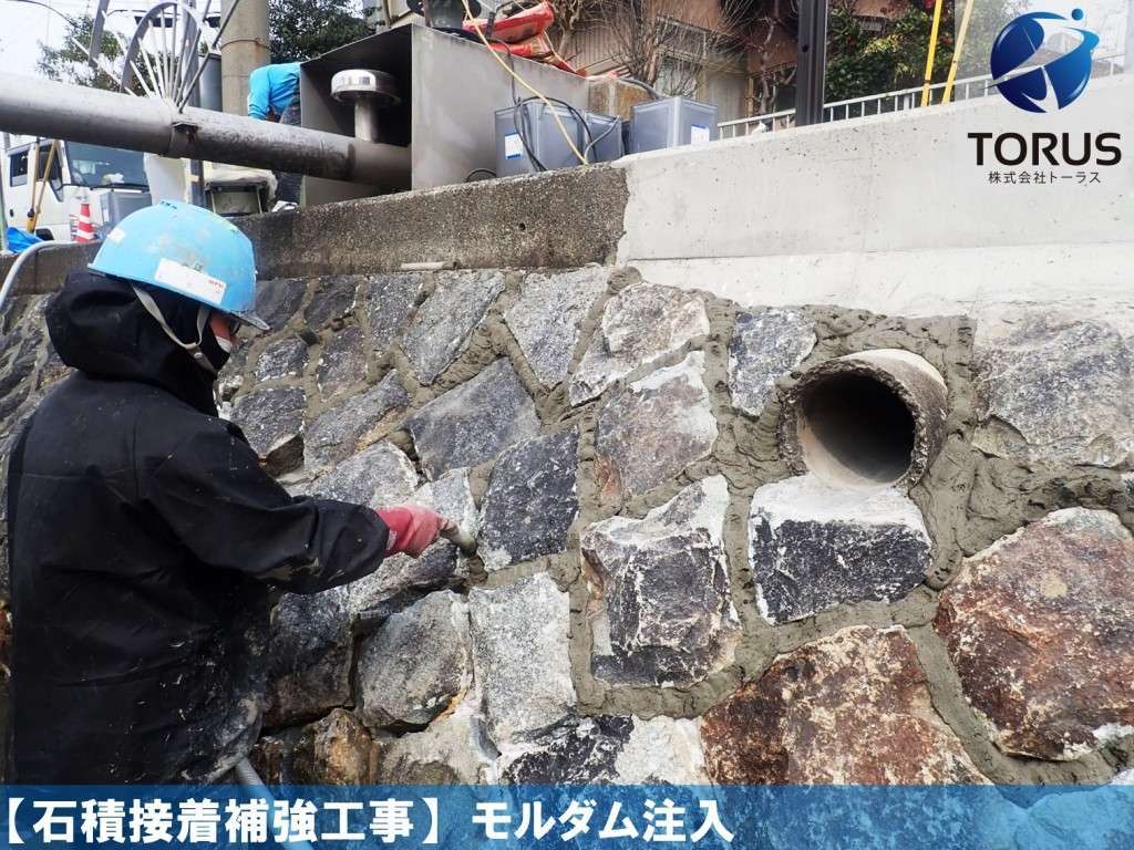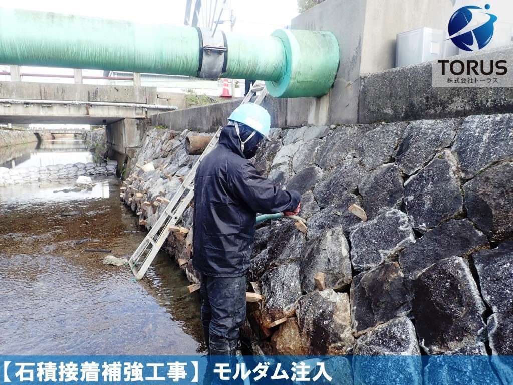 セメント:砂:専用接着剤(モルダムGハイパー)を配合した充填剤をモルタルポンプにて注入します。