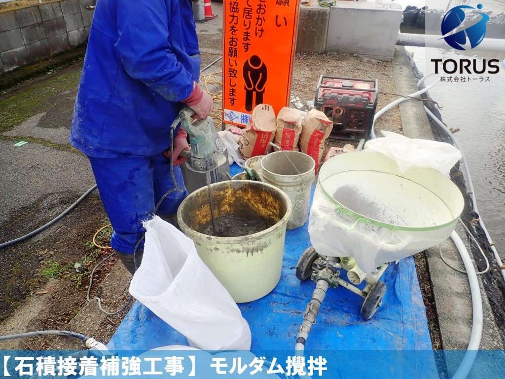 セメント・砂・水・モルダムGハイパーをミキサー・ハンドミキサーにて攪拌します。
