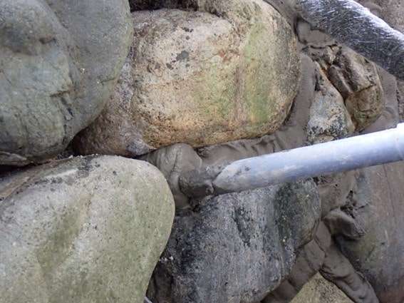 「モルダム工法」とは、既存の石積み内部に接着性の高い石積み専用充填剤を注入して、補修・補強する工法です※。