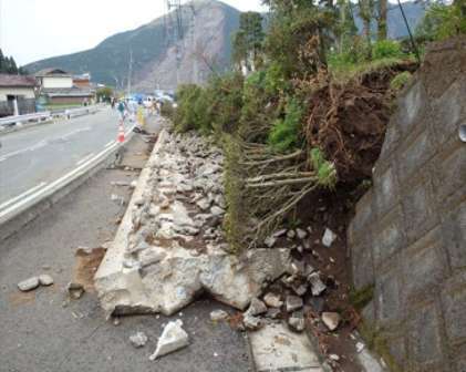 大きな横揺れが起きた際は、写真のように築造されてから間もないブロック擁壁も倒壊してしまいます。