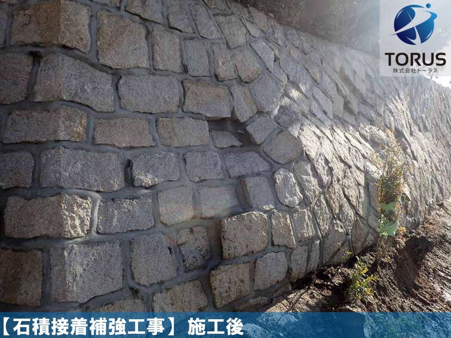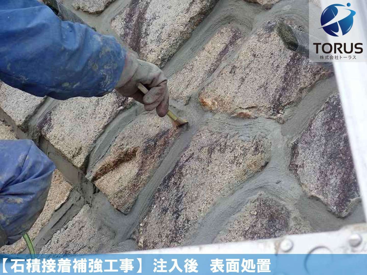 御予算の都合で、一部分のみの施工となりましたが、普通モルタル注入とは違い石積専用接着剤