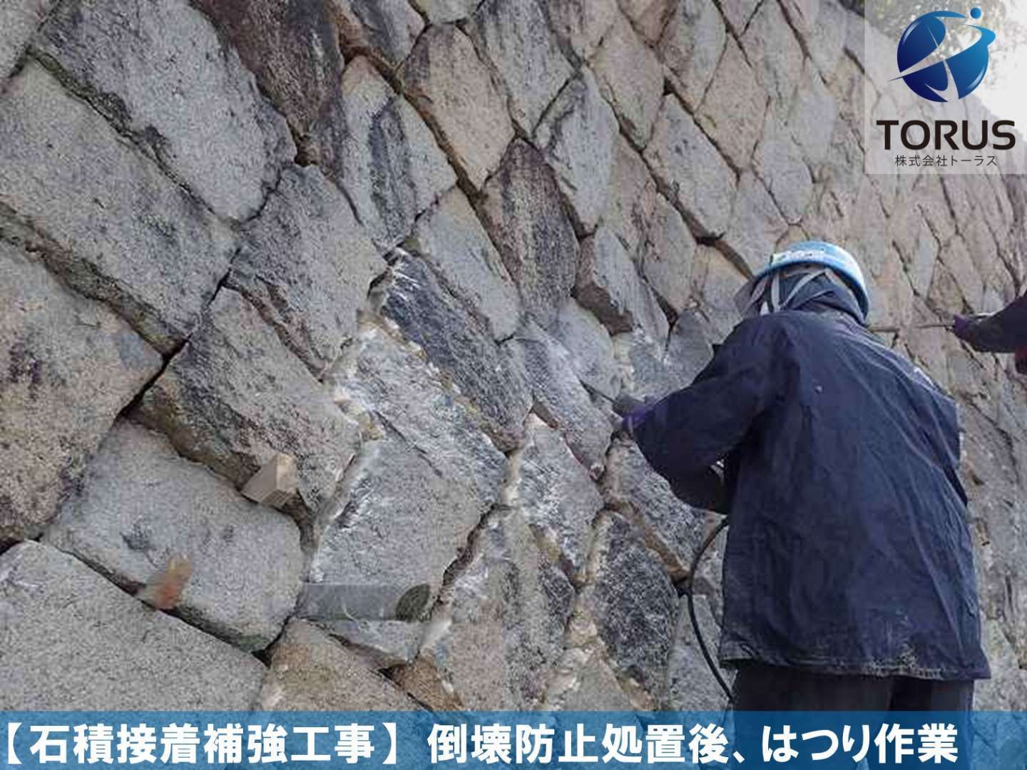 そのままハツリ作業を行うと、倒壊してしまう危険性があるため、石積の状態を慎重に確認し