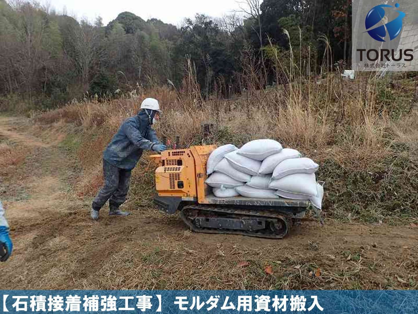 今回の石積接着補強工事(モルダム工法)は現地配合タイプ「モルダムGハイパー」を使用。